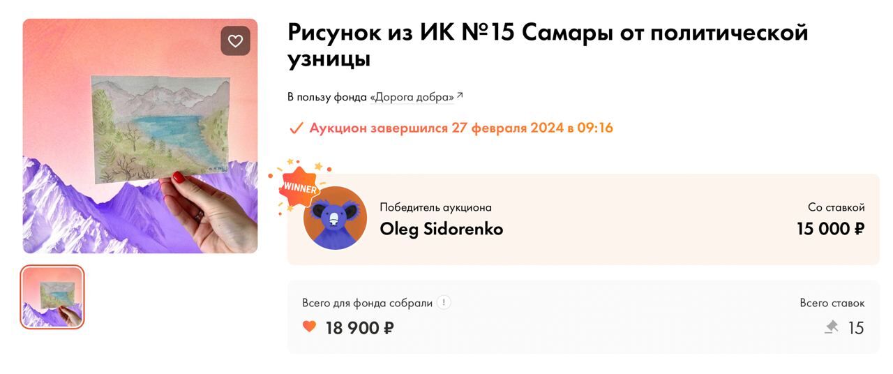 На свободе Евтушенко помогала приютам для животных. Из камеры ПФРСИ («Помещения, функционирующего в режиме СИЗО») это сделать сложнее, но заключенная нашла выход. С помощью волонтеров Евтушенко продала свой рисунок на аукционе за 15 000 рублей. Все деньги платформа «Пользуясь случаем», на которой проходил аукцион, перевела фонду помощи бездомным животным «Дорога добра».