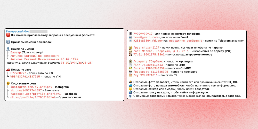Возможно, вы слышали про «Глаз Бога» — телеграм-бот, который по запросу выдает информацию о человеке. Например, номер паспорта и телефона, СНИЛС, ИНН, вероятный адрес проживания, ссылки на страницы в соцсетях и многое другое.
