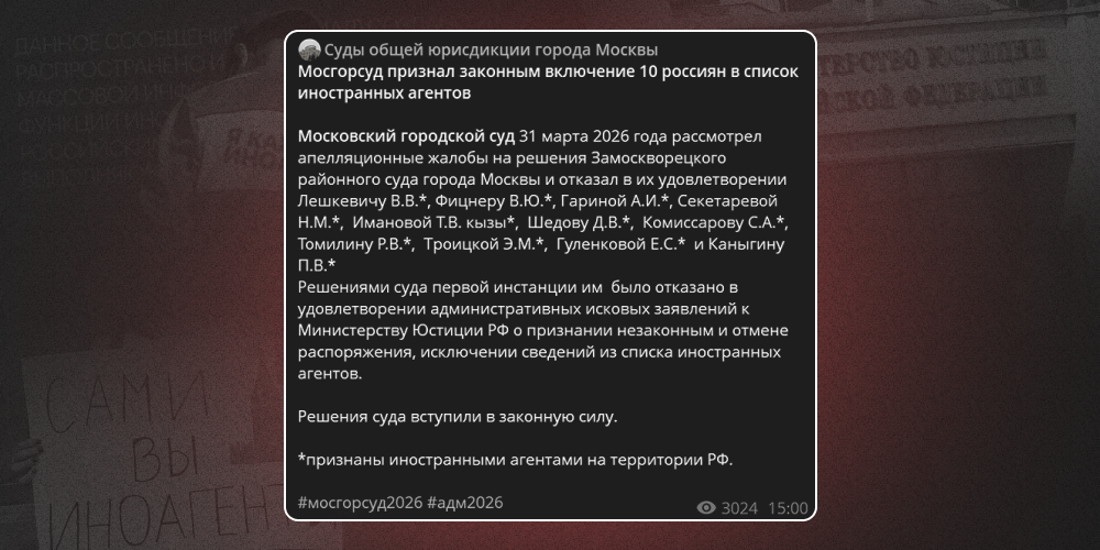 На следующий день Объединенная пресс-служба судов Москвы рассказала о том, что Мосгорсуд признал законным включение десятерых человек в реестр Минюста. Помимо людей, которых действительно объявили «иноагентами», в список пресс-службы Мосгорсуда попали юристы Роман Томилин, Екатерина Гуленкова и Эльнара Троицкая.